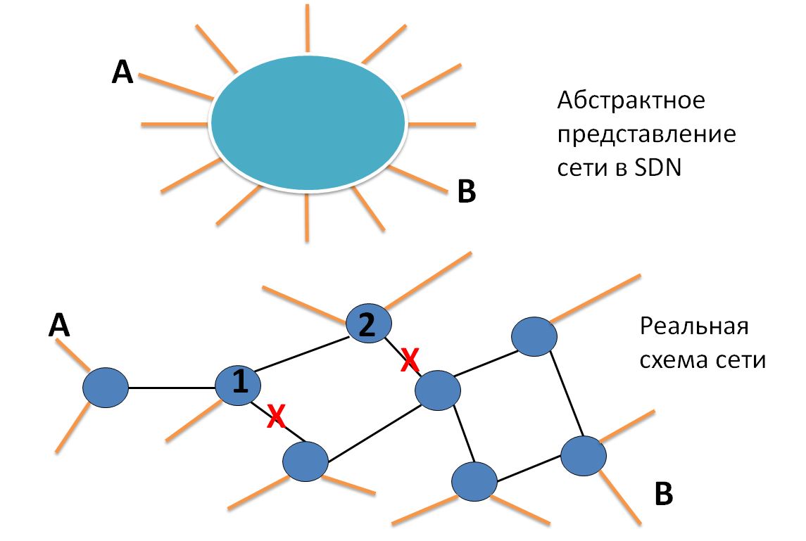 В случае абстрактного представления топологии сети в SDN, администратору следует лишь прописать правило «маршрут от A к В = сброс пакета» в управляющей программной платформе и оно будет действовать всегда, а изменения топологии сети будет автоматически отслеживаться в NOS.