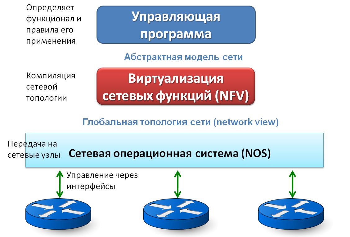 NOS облегчает реализацию, выполнение функциональности сети в целом. Но она никак не определяет эту функциональность. Однако, в архитектуре SDN глобальную топологию сети тоже можно вывести на уровень абстракции, как на верхней части рис. 3, чтобы обеспечить некие правила относительно того, кто с кем может связываться в сети, какой функционал доступен тому или иному пользователю и пр. Для этого в архитектуру плоскости управления SDN вводится еще один уровень – виртуализации сетевых функций NFV (Network Functions Virtualization). NFV реализует через сетевой граф такой функционал, как трансляция сетевых адресов (NAT), параметры межсетевых экранов (firewall), распознавание вторжений, службу доменных имен (DNS), кэширование и пр., забирая эти функции у «железа» сетевых узлов, тем самым, нивелируя особенности реализации на оборудовании различных производителей. Теперь эти функции можно реализовывать и конфигурировать программно, отсюда и название «программно-конфигурируемые сети».