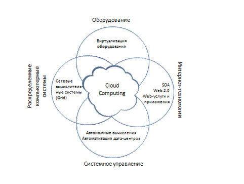 Происхождение СС можно проследить, наблюдая за развитием новых информационных технологий, в особенности аппаратного обеспечения (виртуализация оборудования, многоядерные процессоры), Интернет-технологий (веб-сервисы, сервисно-ориентированные архитектуры, SOA, Web 2.0), распределенных вычислений (кластеры, гриды), технологии системного администрирования (автоматизация вычислений, автоматизация центров обработки данных, ЦОД).