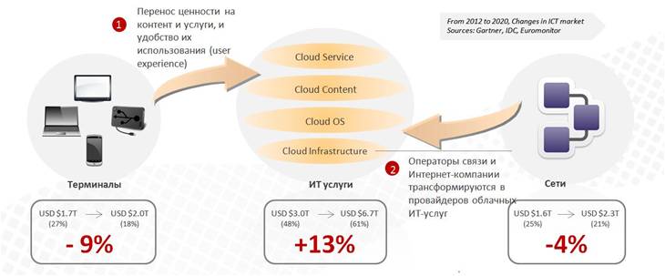 Если условно разделить отрасль телекома и ИТ на три основные составляющие – сети, пользовательские устройства и услуговые платформы, то, опять таки по мнению Gartner, примерно к 2020 году произойдет снижение относительной доли инвестиций в сетевое оборудование на 4%, а в терминалы – на 9% (хотя в абсолютный цифрах инвестиции будут возрастать). Зато на эти 9+4=13% вырастет суммарная доля инвестиций в облачные технологии, куда сейчас постепенно «переезжают» услуговые и сетевые платформы операторов (рис. 2)