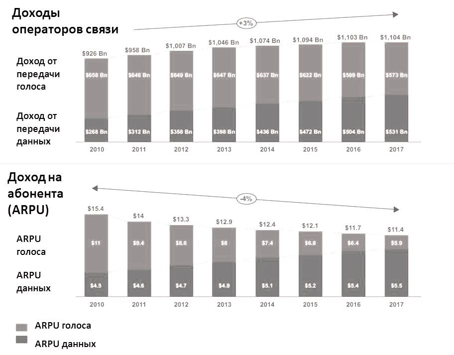 Доходы от традиционных услуг связи (речь + СМС) прекратили рост в 2011-2012 г и снижаются со скоростью 0,2 — 0,5% в год. С другой стороны, объем услуг передачи данных растет и будет преобладать в следующие 5-7 лет. Отсюда можно сделать вывод, что традиционные услуги (речь +СМС) больше не могут быть основой бизнеса операторов связи.