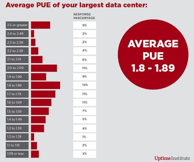 Однако, далеко не все организации могут похвастаться такими замечательными показателями, как Google. В исследовании «Data Center Industry Survey», проведенном в марте-апреле 2012 года, в ходе которого были опрошены 1100 менеджеров ЦОД из Северной Америки (50%), Европы (23%), Азии(14%), а также Центральной и Южной Америк (7%), сообщается, что средний показатель PUE для большинства ЦОД лежит в пределах 1,8-1,89.