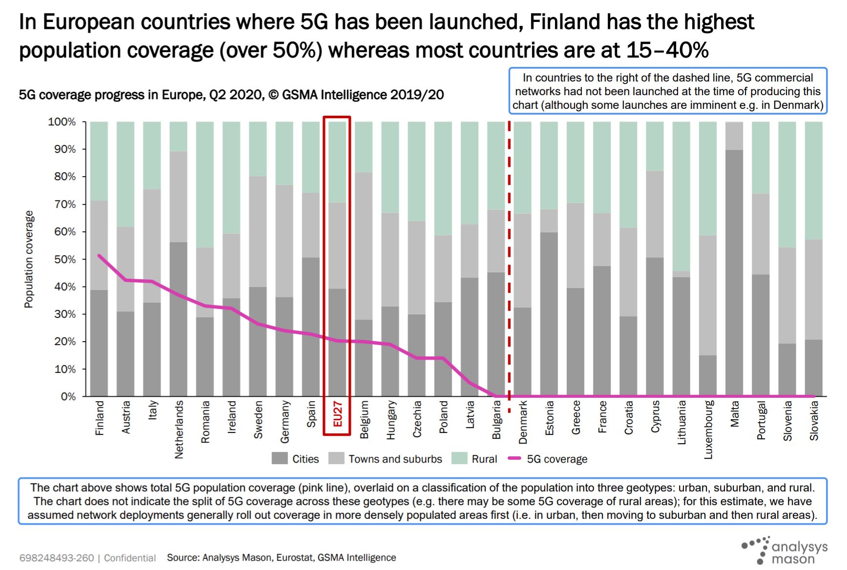 Больше всего в Финляндии — более 50% населения уже могут использовать сети 5G.