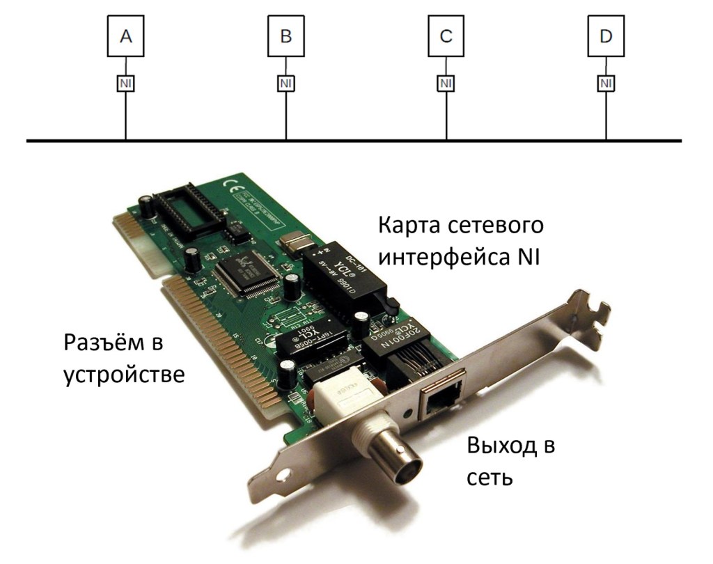 Адрес пакета распознается на сетевом интерфейсе NI (Network Interface), карте в устройстве, которая подключена к кабелю и к процессору устройства.