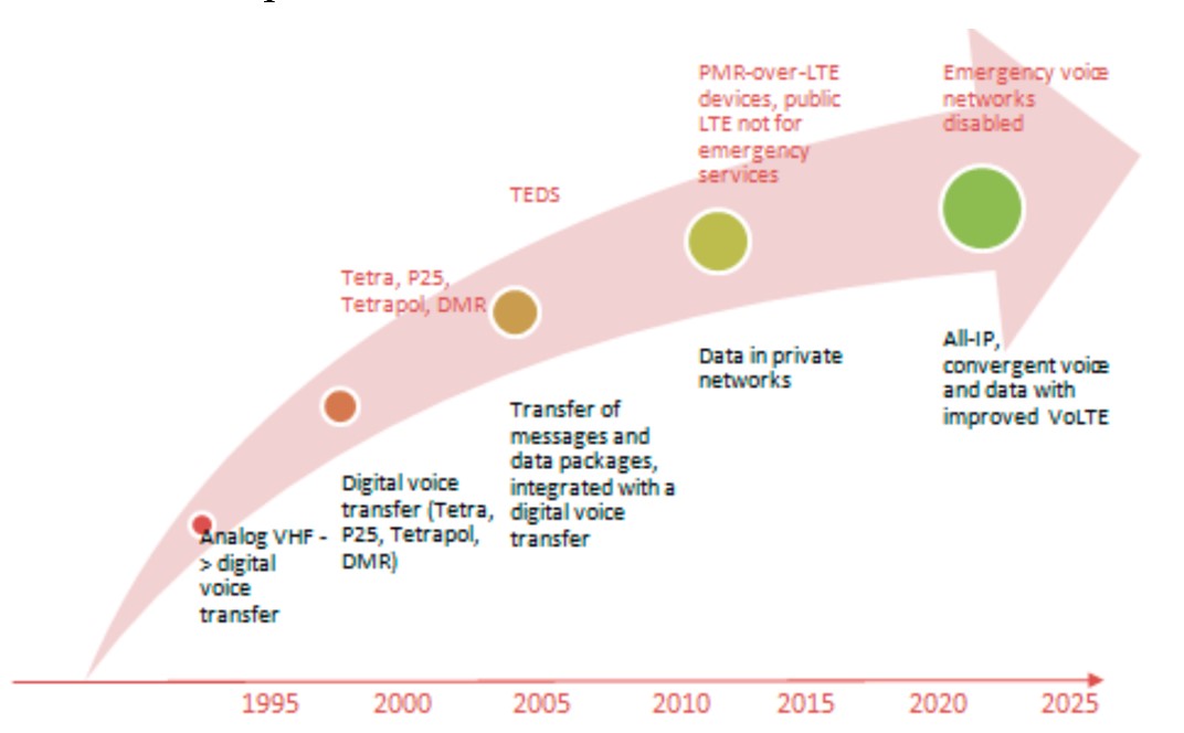 В будущем на горизонте 2025 года прогнозируется, что с развертыванием сетей нового поколения VoLTE и 5G, услуги транкинга, в т.ч. и в чрезвычайных ситуациях будут оказываться на основе общей сетевой инфраструктуры.