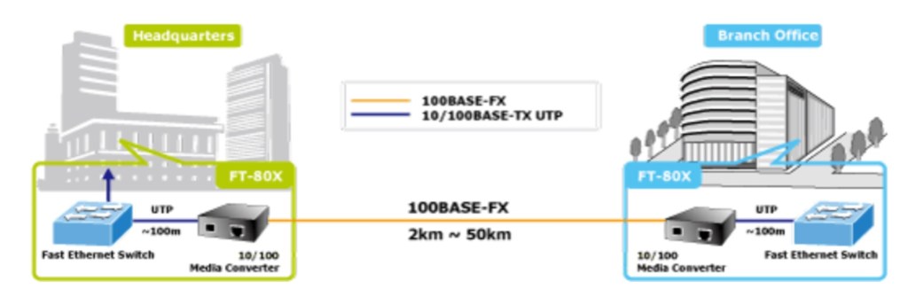В сети Fast Ethernet 100BASE-TX в большинстве случаев невозможно организовать связь между зданиями, вследствие ограничений по длине кабеля «витая пара». В таких случая между зданиями следует использовать оптоволоконные линки «точка-точка», с полным дуплексом, чтобы не возникало коллизий.