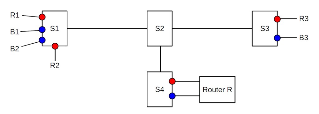Коммутаторы S1 и S3 имеют как «красные», так и «синие» порты. Сеть из коммутаторов S1-S4 будет передавать пакеты только если порт источника и порт получателя будут иметь одинаковые цвета. «Красные» пакеты могут быть переданы в «синюю» VLAN только через маршрутизатор R, попав на его «красный» порт и выйдя через «синий» порт. Маршрутизатор R может также выполнять функции файрволла для ограничения трафика из «красной» VLAN в «синюю».