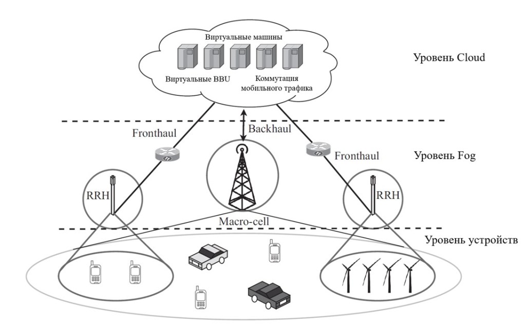 Это вносит иерархичность в архитектуру сетей 5G, на верху которой находится облако Cloud, и макро- и микро-сотами на границе сети и устройствами пользователей и IoT внизу. С точки зрения Fog Computing, макро- и микросоты образуют Fog-узлы, в которых производится обработка данных, выполнение кода приложений, а также хранение данных. Пакеты, посылаемые устройствами в сеть устройствами, анализируются в микро-соте или в макро-сотовой базовой станции (точнее сказать, в её виртуализированном базовом блоке BBU), перед тем как быть отправленными (или неотправленными) в опорную сеть и далее в Cloud.
