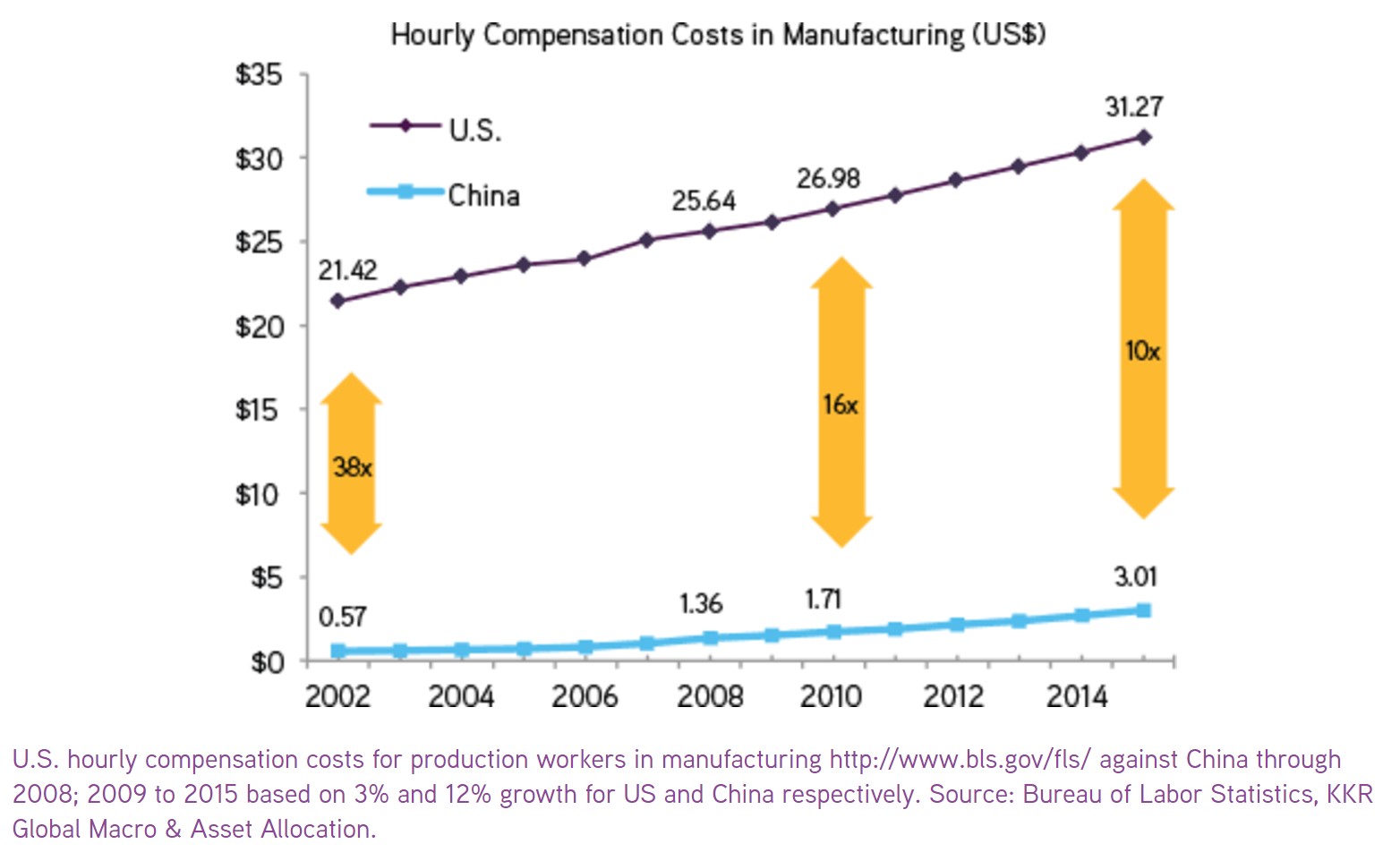 Хотя в абсолютном выражении стоимость рабочей силы в Китае остается значительно меньшей, чем в США, однако разрыв между ними значительно сократился в последние 15 лет[9] (38 раз в 2000 году и 10 раз в 2015 году, см. рисунок ниже).
