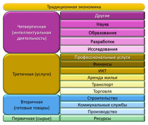 В конце 20-го века многие экономисты стали выделять и 4-й (четверичный, quarternary) сектор: часть экономики, основанная на знаниях [2]. Сюда входят информационные технологии, генерация и совместное использование информации, медиа-технологии, исследования и разработки, услуги знаний: консультирование, образование, финансовое планирование, блогерство и копирайтинг, а также услуги дизайна (см рисунок ниже).