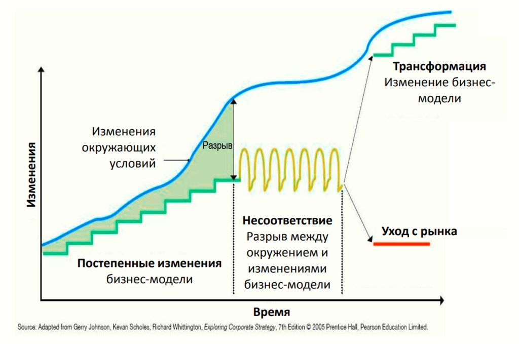 Необходимость в трансформации бизнес модели возникает тогда, когда изменения окружающих условий начинает опережать постепенные, эволюционные изменения бизнес модели. Когда разрыв становится слишком большим, и разрыв между окружением и бизнес-моделями начинает лихорадить повседневную работу, то у финансовой организации остаётся два выхода: либо осуществить глобальную трансформацию бизнес модели, либо уйти с рынка.