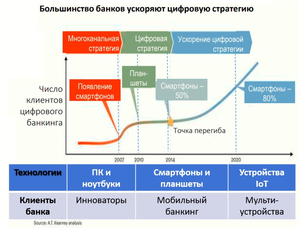 Да и против того, что банки постепенно ускоряют свою стратегию цифровой трансформации тоже сложно возразить. Точка перегиба действительно произошло на рубеже 2015-2015 годов, когда число смартфонов у клиентов банков превысило число обычных кнопочных телефонов.
