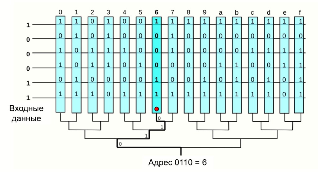 На рисунке, разрядность слова данных равна 6, и есть 16 регистров пронумерованных от 0 до F в шестнадцатеричной системе. В регистре 6 записано число 100011, соответствующее входным данным. Выходное слово схемы кодирования является соответствующим адресом 0110.