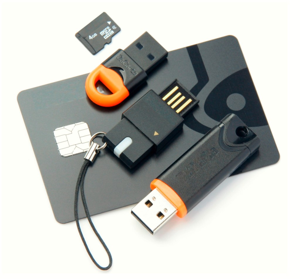 Для корпоративных клиентов могут также использоваться т.н. «USB-токены», представляющие собой USB-флешку с записанной на ней идентификационной информацией, или обеспечивающие автоматическое взаимодействие с облачной системой идентификации, а также специальные чиповые карты. Они могут выглядеть, например, так.