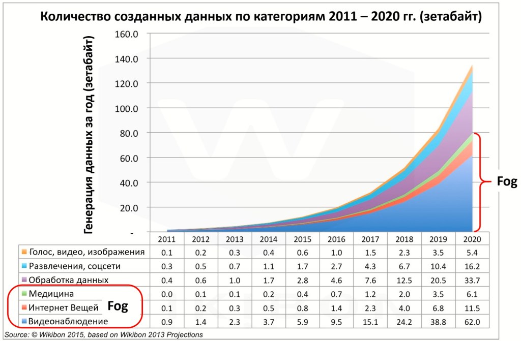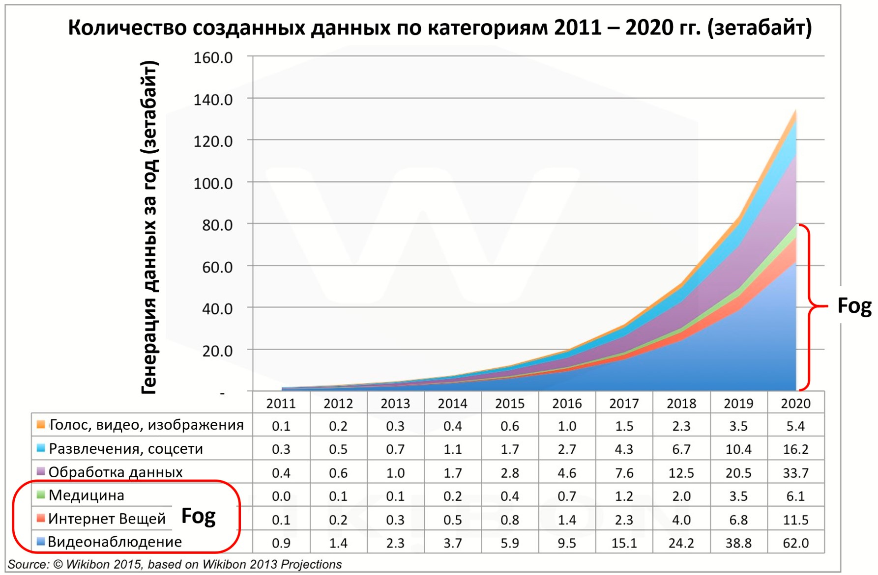 Самый быстрый рост объема создаваемых данных в последние годы наблюдается в трёх секторах: видеонаблюдение, Интернет Вещей и медицина (носимые устройства, генерация данных в медучреждениях)[1].