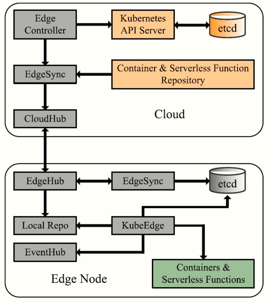 - KubeEdge. Kubernetes – это система оркестрации контейнеров open-source для Cloud Computing, разработанная Google, и поддерживаемая сообществом Cloud Native Computing Foundation, принадлежащем Linux Foundation. Kubernetes предназначена для автоматического развёртывания и управления масштабных облачных приложений, с использованием контейнеров, таких как Docker. Однако, поскольку Kubernetes «заточена», в основном, на облако, у неё нет хорошей системной поддержки Edge. Поэтому в компании Huawei была разработана open-source платформа для взаимодействия Cloud-Edge под названием KubeEdge[3], которая призвана обеспечить хорошее взаимодействие Kubernetes между Cloud и Edge.