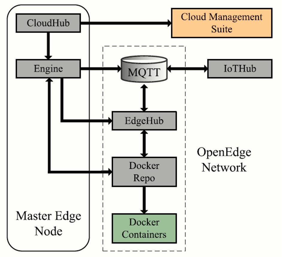 - OpenEdge: это проект open-source компании Baidu[4], цель которого состоит в создании гибкой платформы Edge Computing, которая без проблем расширяла бы функционал Cloud Computing на устройства Edge. OpenEdge предназначена для работы с платформой управления облаком (Cloud Management Suite) Baidu IntelliEdge (BIE) в различных сценариях взаимодействия Cloud-Edge. OpenEdge построена по модульному принципу с использованием контейнерных технологий. Она содержит две части, работающие на границе сети Edge: мастер-процесс, как общая система управления и набор загружаемых модулей-плагинов. Кроме того, OpenEdge может работать в двух режимах: с контейнерами Docker и в режиме собственной обработки, когда приложения выполняются как обычные процессы Linux. На рисунке ниже показаны компоненты OpenEdge, серый цвет – OpenEdge, оранжевый цвет – Cloud. Компонент Engine на мастер-узле Edge (Master Edge Node) принимает данные события IoT от устройства IoT Hub, которое собирает информацию с датчиков Интернета Вещей (IoT), через транспортный модуль очерёдности сообщений телеметрии MQTT (Message Queuing Telemetry Transport). Чтобы обрабатывать эти события, компонент Engine коммуницирует с компонентом EdgeHub, а также с компонентом Docker Repo, чтобы выполнить соответствующие вычисления в контейнерах Docker. Компонент Engine может также коммуницировать с системой управления облаком Cloud Manаgement Suite для того, чтобы синхронизировать Master Edge Node с облаком.