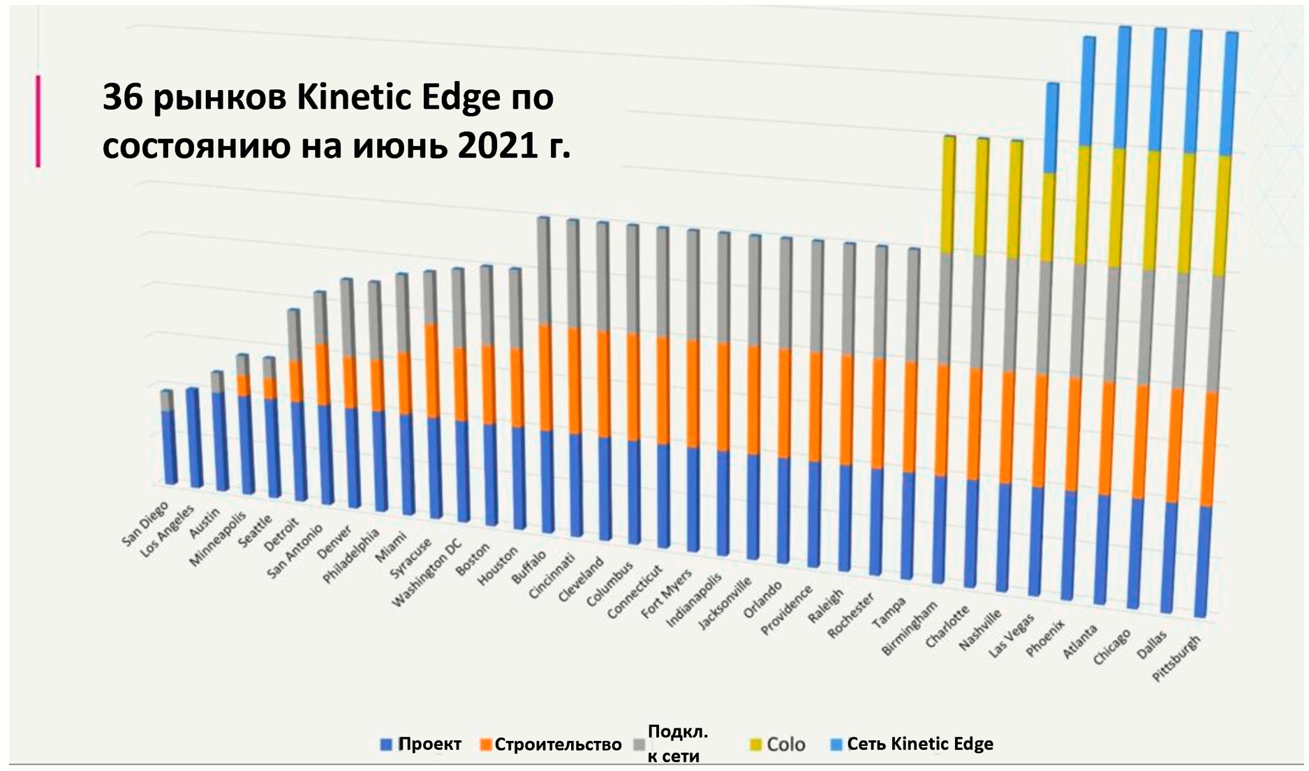 К началу 2021 года сотни сайтов Kinetic Edge уже развёрнуты на 36 рынках США, крупнейшие из которых – Чикаго, Атланта, Даллас и Питтсбург. Каждый из этих рынков представляет собой зону высокой доступности и полностью управляем оборудованием заказчика в зависимости от нагрузки.