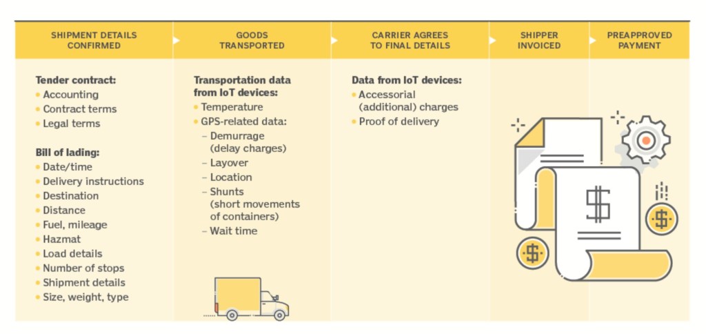 В транспортной отрасли поставок и логистики смарт-контракты могут разблокировать средства после того, как грузовой контейнер прибыл в пункт назначения, и датчики Интернета вещей показывают, что он остался неоткрытым, а его содержимое поддерживалось при нужной температуре, соответствующей влажности и не слишком сильно давилось в пути.