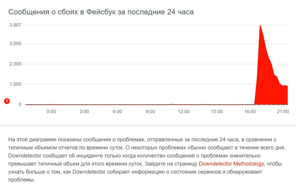 Около 18:00 по московскому времени перестали работать Facebook и принадлежащие ему WhatsApp и Instagram. Сообщения о недоступности, по данным сайта Downdetector.ru, наблюдаются по всему миру.