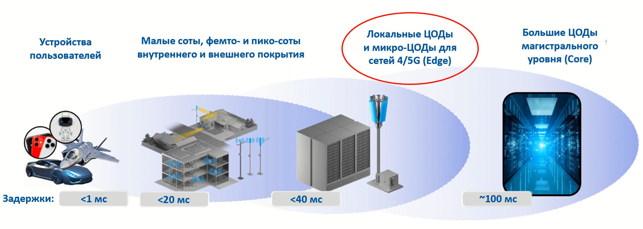 Исключением могут являться только корпоративные (ведомственные) сети 5G, построенные в масштабах отдельных предприятий. Однако, и сами эти корпоративные ИТ-системы и сети строятся именно на таких же небольших ЦОДах и микро-ЦОДах, которые в сети 5G используются в качестве локальных и граничных.