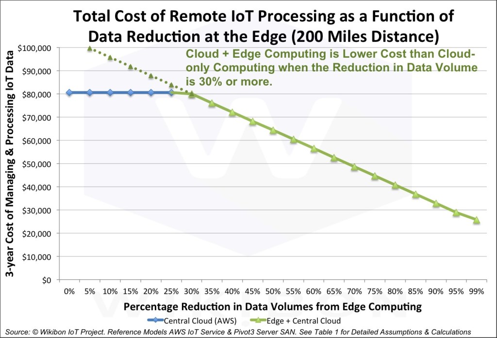Вот данные компании Wikibon по сравнению затрат на управление и обработку данных за три года в центральном облаке (Cloud Only) c затратами при развёртывании ещё и дата-центров Edge при расположении центрального дата-центра в 200 миль от границы сети. При таком режиме до 70% данных предварительно обрабатываются на границе сети, а в центральное облако Cloud отправляются только отфильтрованные и обработанные данные.