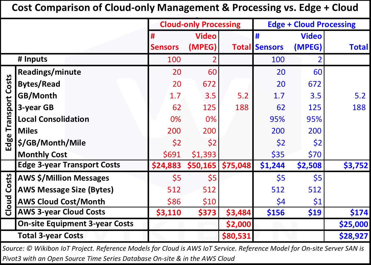 Вот детальное сравнение стоимости обработки данных в режиме Edge + Cloud с режимом Cloud only. Нетрудно видеть, что основная экономия достигается за счёт снижения доли транспортировки трафика через сеть оператора: $3752 против $75048 долларов. Цифры говорят сами за себя.
