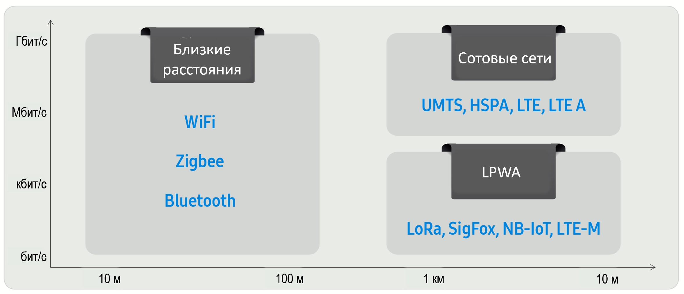 Сравнение протоколов IoT по дальности и скорости