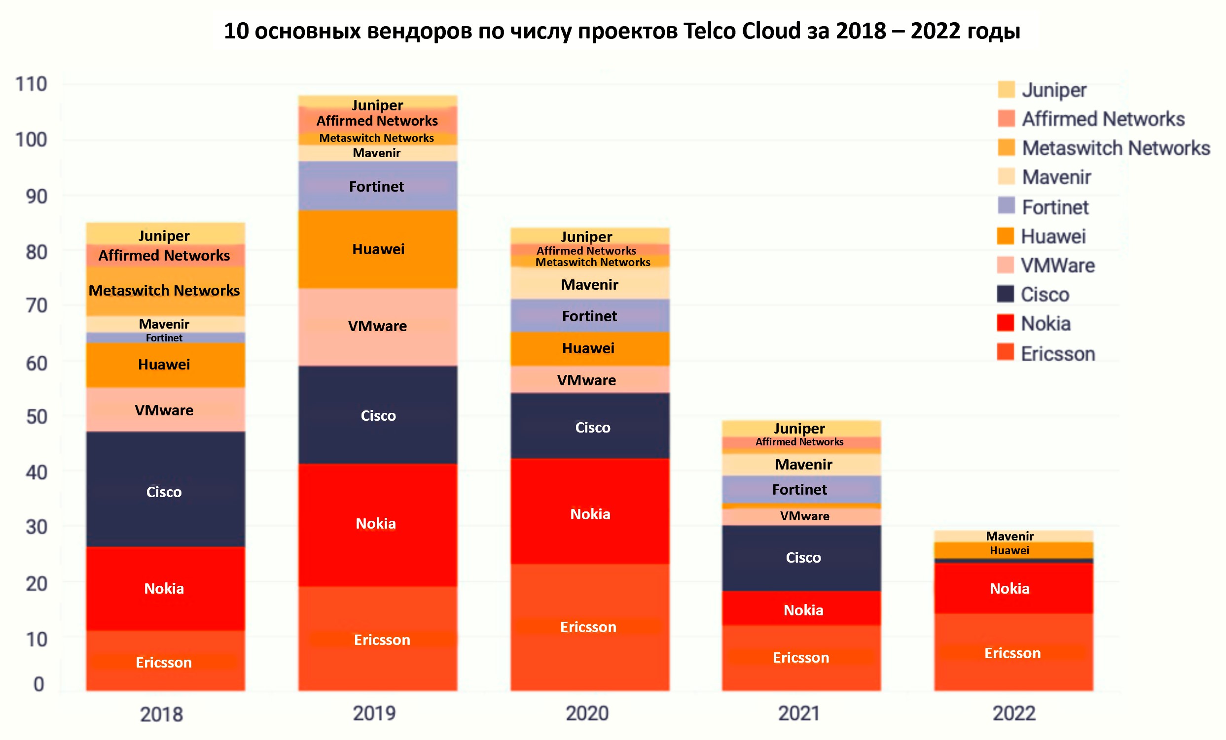 Ниже показана диаграмма числа проектов Telco Cloud для основных вендоров за 2018 — 2021 годы и прогноз на 2022 год.