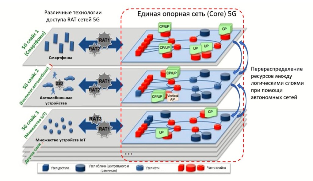 Сеть 5G фактически будет иметь «слоистую» структуру (Network Slicing) для реализации различных типов услуг: традиционного ШПД, автономных автомобилей, умного дома и умного города, автоматизации производства, ЖКХ и многих других отраслей на базе единых физических ресурсов опорной сети (Core).