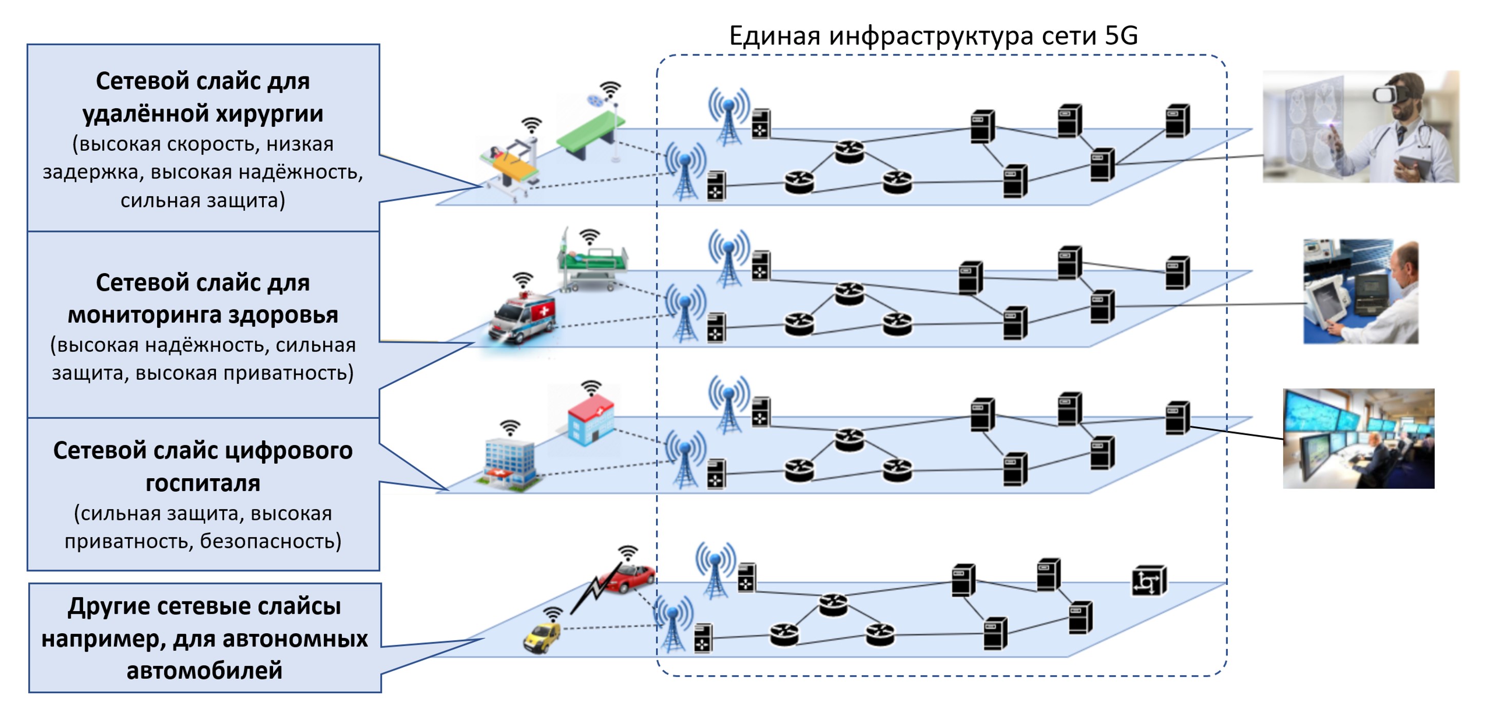 Рис. 5. Сетевые слайсы для различных функций и приложений в единой инфраструктуре сети 5G.