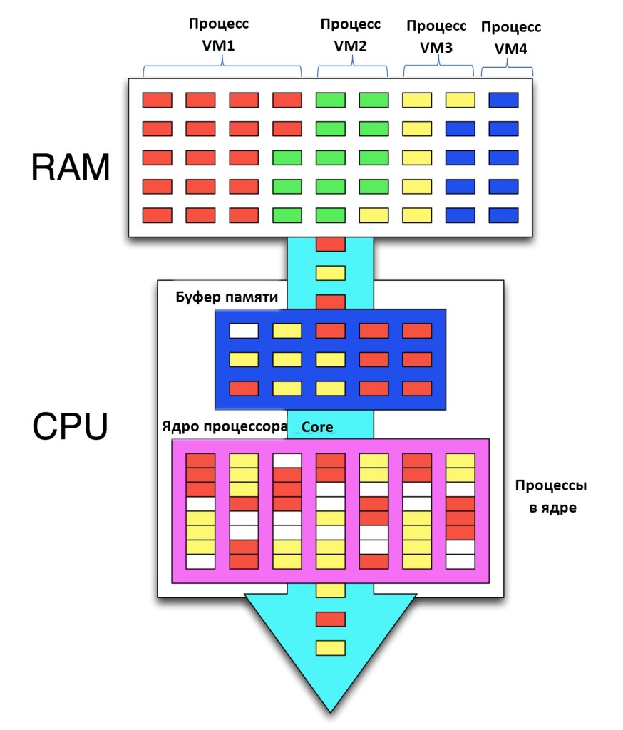 В реальности все несколько сложнее, поскольку в этом процессt приходится задействовать еще и области памяти RAM, выделяя её области под процессы виртуальных машин, а также буфер памяти процессора CPU (регистры и кэш, который может быть нескольких уровней). Очередность выполнения определяется планировщиком задач процессора (Scheduler), который управляется гипервизором, а тот в свою очередь, выполняет политики, заданные приложениями, которые порождают потоки данных.