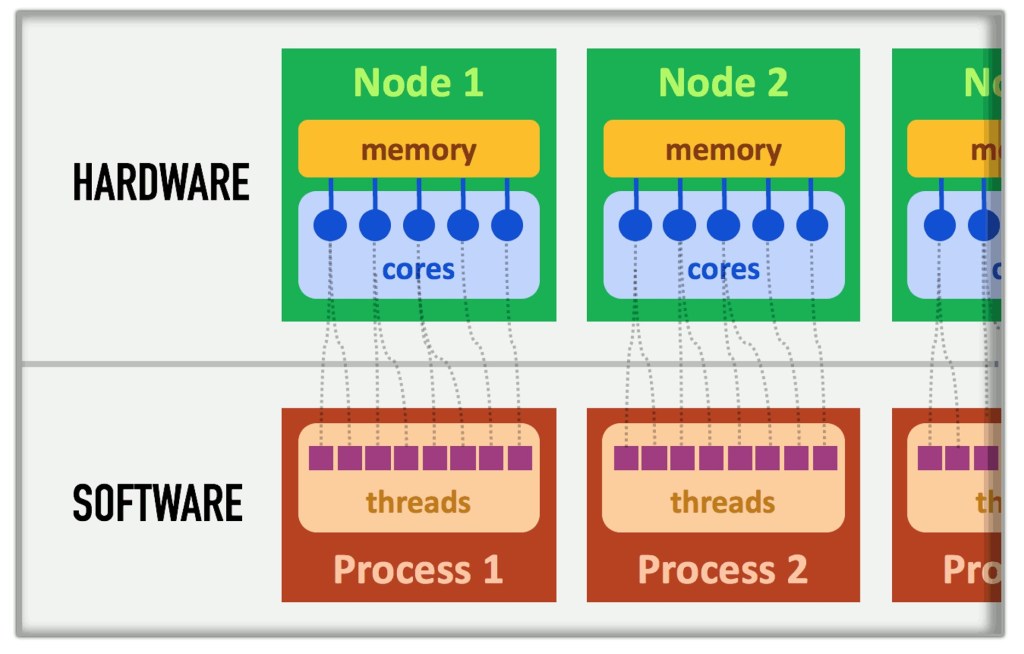В общем и целом, можно получить следующую картину обработки потоков процессов VM. При помощи программной обработки, процессы (Process) различных VM делятся на потки (threads), которые обрабатываются в ядрах (Cores) процессоров CPU (Node), использующих общую память (memory). Таких узлов Node может быть довольно много, и они не обязательно должны совпадать с физическими процессорами. То есть, один процессор может обрабатывать несколько узлов Node, а также и узел Node может занимать ресурсы нескольких процессоров.