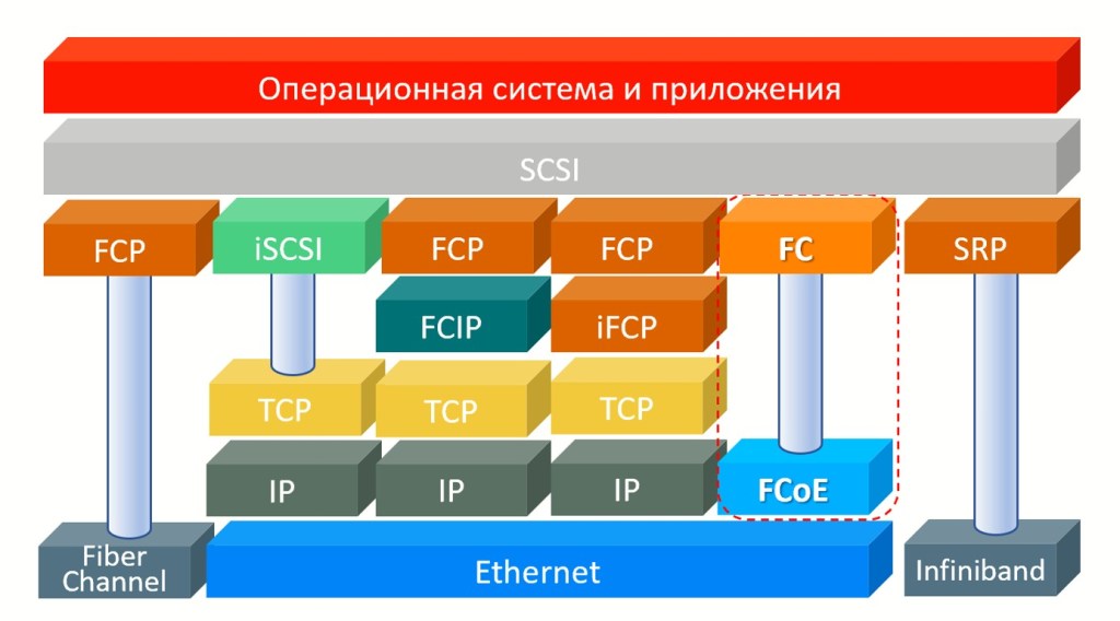 В компьютерных сетях, как известно, существуют два основных вида транспортных протоколов: FC (Fibre Channel) и Ethernet. Правда, есть ещё IB (InfiniBand), но он не так распространён, как первые два, вследствие высокой стоимости и сложности реализации, и применяется IB, главным образом, в высокопроизводительных компьютерных кластерах.