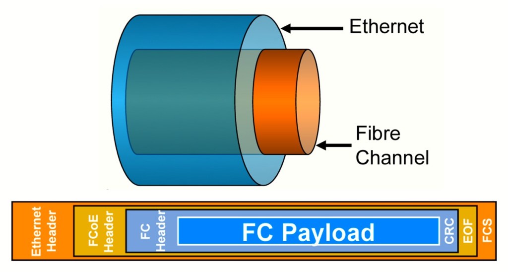 FCoE (Fibre Channel over Ethernet) это транспортный протокол, рахзработанный в 2009 г. для переноса фреймы Fibre Channel по сети Ethernet, с инкапсуляцией кадров FC во фреймы Ethernet.