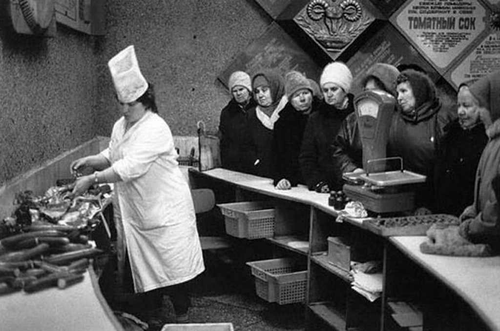 При Сталине с Хрущевым, во времена «Книги о вкусной и здоровой пище», продукты в магазинах ещё были, но есть их было решительно некому: все эти балыки, масло, икра — народу были недоступны по причине дороговизны. А затем и общего дефицита. По свидетельствам продавцов того времени, масло покупали по 30-50 гр., конфет — по 100 гр., колбасы — от силы 300 гр. И не каждый день. За «маслицем» старушки приходили после пенсии. «Полакомиться»… Когда моя мама, проходя стажировку в гастрономе, спросила на каком-то собрании, почему масла по 30 граммов берут, ей ответили: «Очень актуальный вопрос, товарищ стажер! Наши люди хотят каждый день есть свежую продукцию, поэтому ежедневно приходят в магазин за новой порцией масла и колбасы».