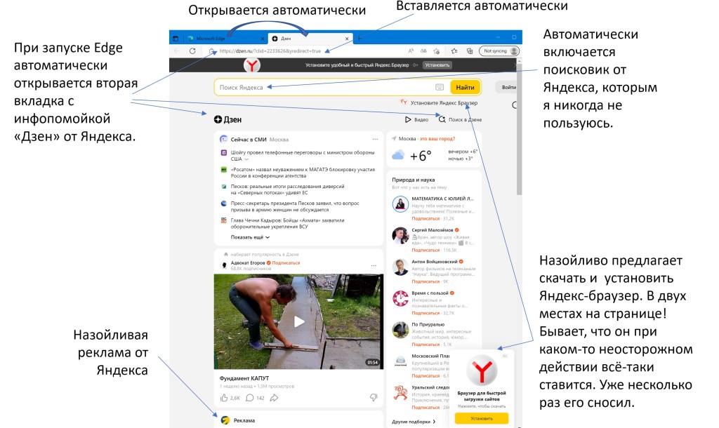 При запуске Microsoft Edge, сразу автоматически открывается вторая вкладка со страницей Яндекс-Цзен. По моему мнению, это информационная помойка.