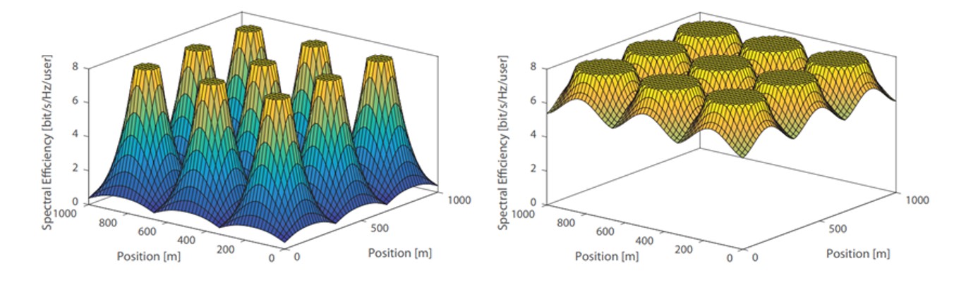 Рисунок 2. Слева – диаграмма спектральной эффективности традиционной сети доступа с сотами базовых станций, справа – сети cell-free[1].