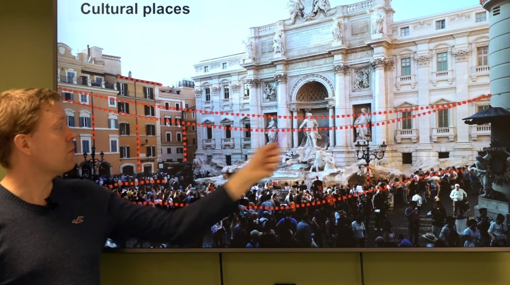Такие полосы удобно применять для покрытия, например, тех мест, где на крыше зданий нельзя ставить базовые станции, но нужно обеспечить хорошее покрытие для массовых мероприятий. На рисунке ниже профессор Бьёрнсон показывает, как при помощи радиополос, свободно подвешиваемых в пространстве, покрывается историческая площадь в Риме с большим скопление людей, которые активно шлют фото и видео события.