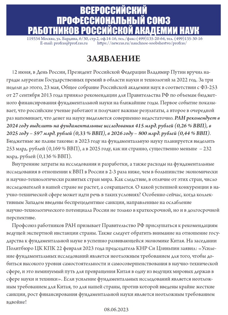 Профсоюз работников РАН призывает Правительство РФ прислушаться к рекомендациям ведущей экспертной инстанции страны. Также следует обратить внимание на отношение государства к фундаментальной науке в успешно развивающейся экономике Китая. На заседании Политбюро ЦК КПК 22 февраля 2023 года председатель КНР Си Цзиньпин заявил: «Усиление фундаментальных исследований является неотложным требованием для того, чтобы добиться высокого уровня самостоятельности и самосовершенствования в научно-технической сфере, и это неминуемый путь для превращения Китая в одну из ведущих мировых держав в сфере науки и техники».