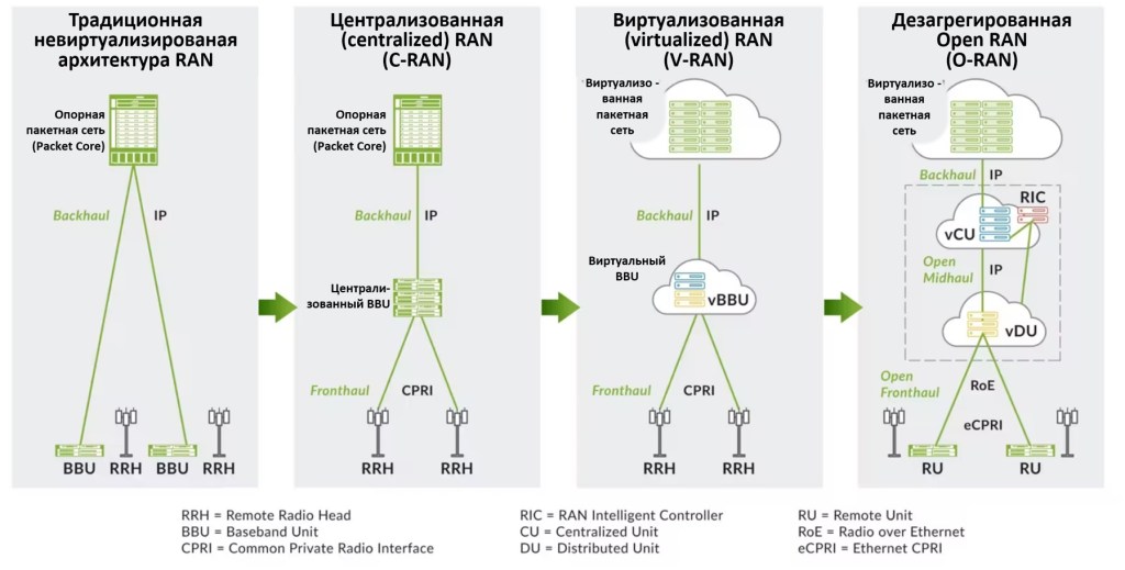 Эволюция архитектуры RAN в направлении виртуализации и дезагрегирования компонентов показана на рисунке ниже.