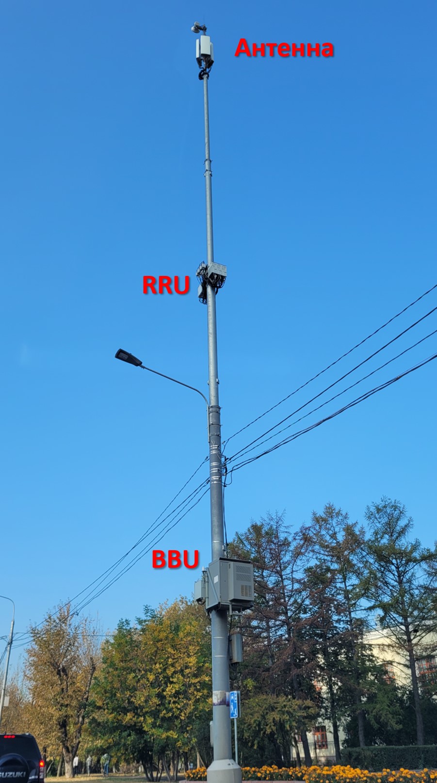 В традиционной архитектуре сети предыдущих поколений 2G – 4G, сеть доступа переставляла собой «монолитную» базовую станцию, содержащую блок обработки базовой частоты BBU, радиоблок RRH, которая была связана радиочастотным фидером с трехсекторной антенной на вышке (рисунок 1 слева, фото ниже).