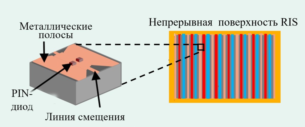 Технология имплантирования PIN-диодов, использующая программируемые метаматериалы, которые реализуют практически непрерывную апертуру, показана на ниже [18]. Для изготовления такой структуры используется метаповерхность, которая отражает и преобразовывает электромагнитные волны в широком частотном диапазоне. Это непрерывная однослойная металлическая поверхность, которая состоит из практически бесконечного числа мета-частиц.