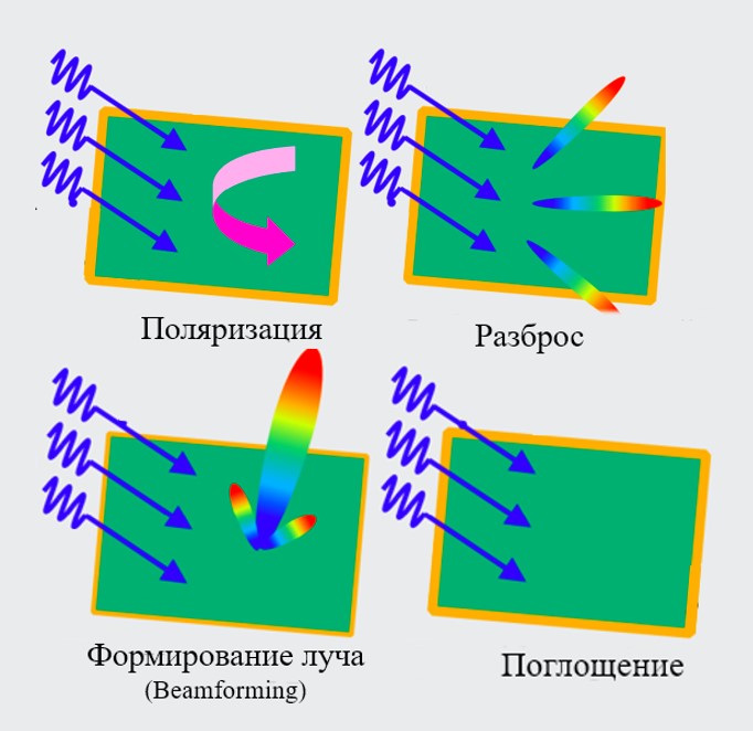 - Поглощение электромагнитных волн. При этом HMIMOS действует как поглотитель падающих на интеллектуальную поверхность электромагнитных волн таким образом, что отражённые волны взаимно гасят друг друга.