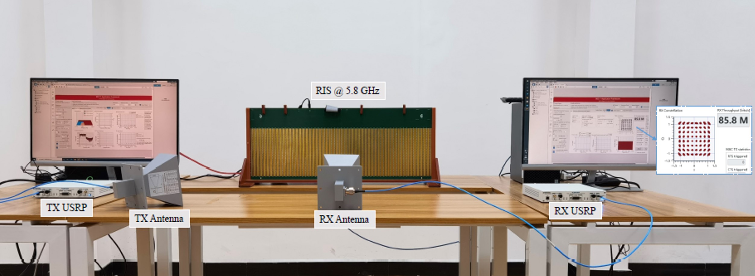 Испытательный стенд включал в себя антенну передатчика (TX Antenna), антенну приёмника (RX Antenna), поверхность RIS, настроенную на частоту несущей 5.8 ГГц, а также станции управления TX_USPR и RX_USPR на сторонах передачи и приёма, которые эмулировали пользовательское оборудование и точку доступа (либо базовую станцию). По радиоканалу с RIS передавался видеопоток. Для упрощения эксперимента чувствительность элементы RIS были ориентированы в горизонтальном направлении, поскольку пользователи с радио-терминалом чаще перемещаются в горизонтальной плоскости и реже – в вертикальной. В ходе эксперимента было испытано слежение направленным лучом за перемещающимся в горизонтальной плоскости приёмником видеопотока.