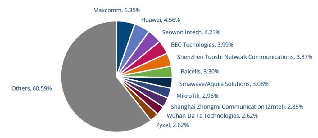 Производителей оборудование FWA в мире уже довольно много, на рисунке ниже показаны крупнейшие из них и их доли рынка.
