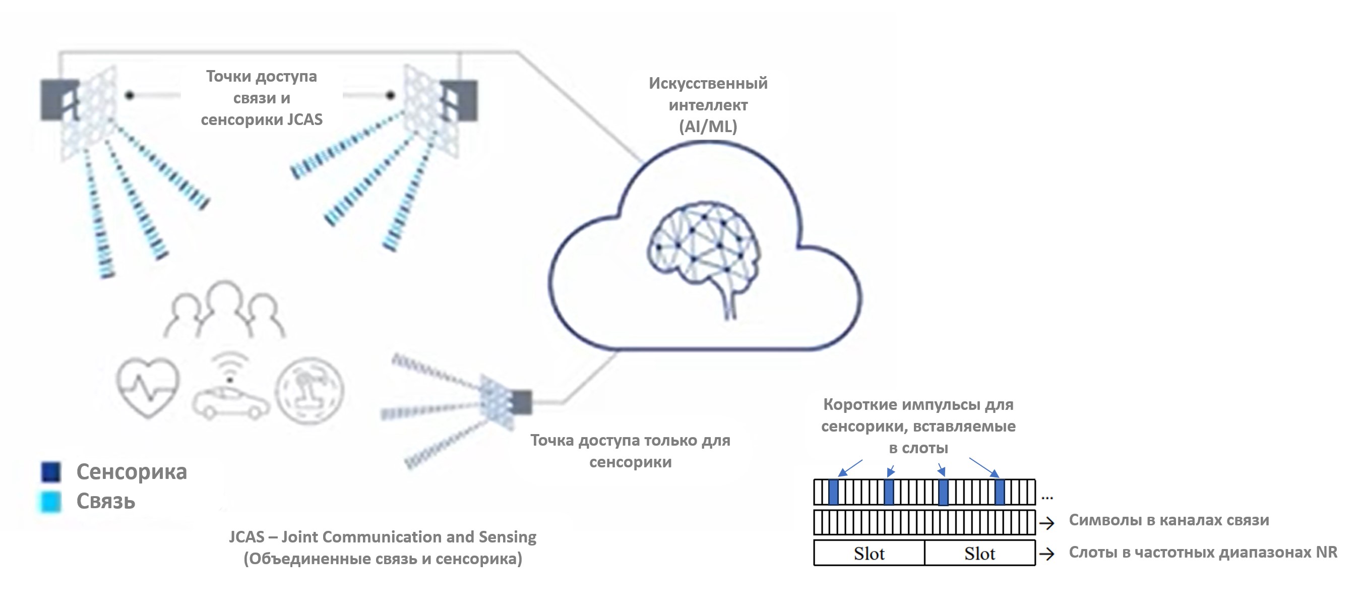 Точки доступа с функцией сенсорики посылают и принимают сигналы, обнаруживающие объекты, а искусственный интеллект с машинным обучением (AI/ML) классифицирует комплекс информации связи и сенсорики для получения полной информации об объектах (которые сами по себе не обязательно содержат сенсоры и датчики) и управления этими объектами. Для этого в слоты (кадры связи) в диапазоне NR (New Radio) вставляются короткие импульсы сенсорики для обнаружения и считывания свойств объектов, которые обрабатываются при помощи искусственного интеллекта и машинного обучения (AI/ML)[1].