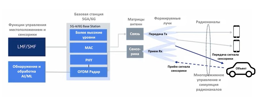 При помощи многорежимного управления и симуляции радиоканалов становится возможным обнаруживать объекты, их местоположение и определять их свойства и природу. Основной сложностью при таком подходе является то, как правильно сканировать радиоканалы, чтобы соответствующим образом определять свойства и характеристики объектов. Для этого нужно управление радаром OFDM при помощи искусственного интеллекта и машинного обучения AI/ML. В соответствии с этим происходит гибридное формирование лучей (Hybrid Beamforming), как в антенной матрице для связи и излучения импульсов сенсорики, так и в антенной матрице для приёма сигналов сенсорики. При этом, полученная информация от каналов сенсорики может влиять на частоту, интенсивность и направленность испускаемых импульсов сенсорики в каналах связи.
