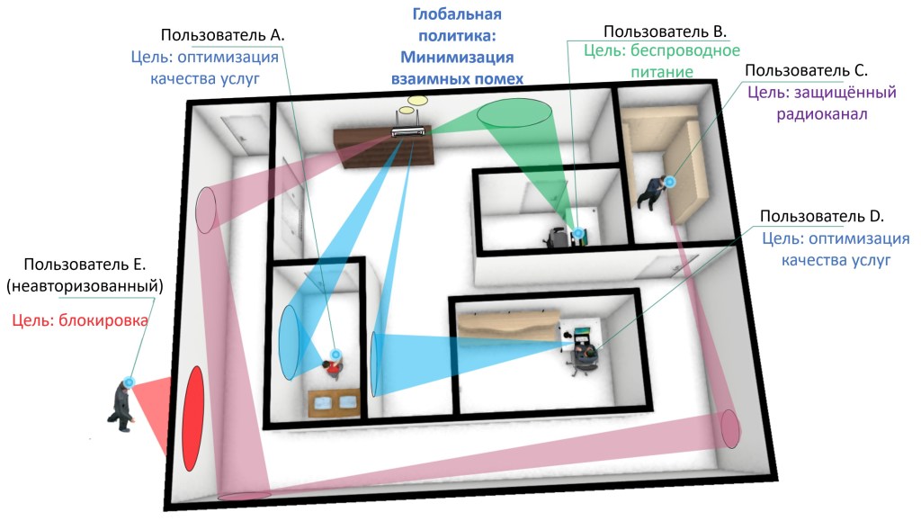 Рассмотрим сценарий беспроводной связи в пространстве, как показано на рис. 2. Нескольким пользователям требуется подключение к локальной беспроводной сети, причём каждый из них имеет разные требования. Пользователи A и D заинтересованы в оптимальном качестве соединения, пользователь B заинтересован в беспроводной передаче энергии, а пользователь C требует принятия мер по защите своего подключения. Пользователь E пытается получить несанкционированный доступ и подлежит блокировке.
