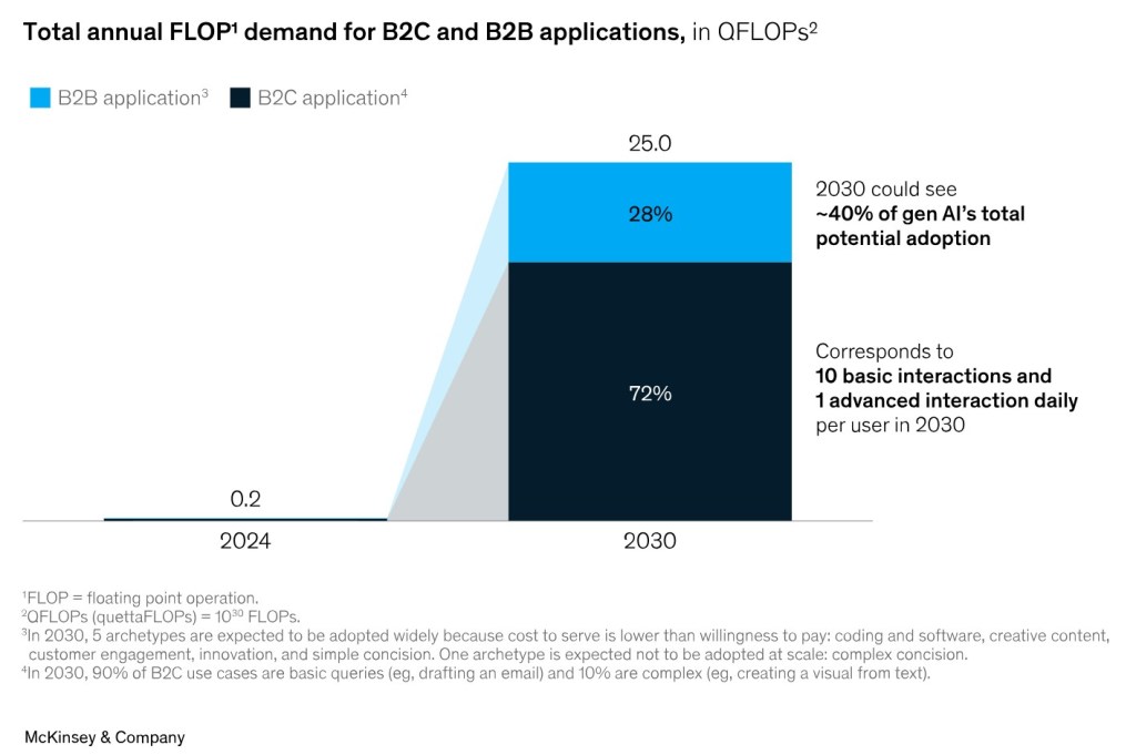 По оценкам McKinsey, к 2030 году в базовом сценарии общая потребность в вычислениях поколения ИИ может достичь 25×1030 FLOP (операций с плавающей запятой), при этом примерно 70 процентов придется на приложения B2C и 30 процентов на приложения B2B (Рисунок 1).